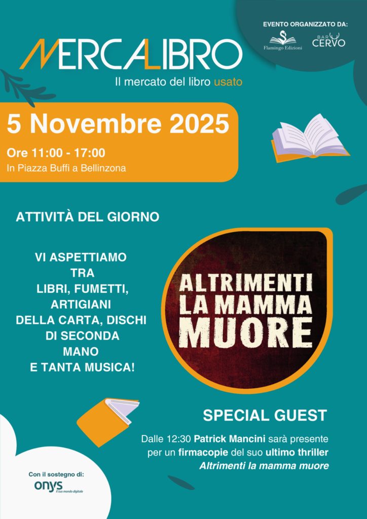 Lo storico mercatino del libro usato torna a Bellinzona in Piazza Buffi il 5 novembre! Per l’occasione sarà presente Patrick Mancini a firmare il suo nuovo thriller targato Flamingo Edizioni: “Altrimenti la mamma muore”
