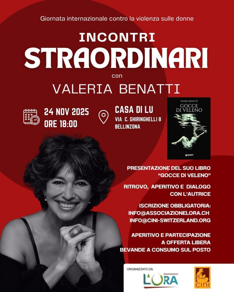 In occasione della giornata internazionale contro la violenza sulle donne, la giornalista e scrittrice Valeria Benatti, da sempre impegnata sul tema, presenterà il suo libro „Gocce di Veleno“ e dialogherà con i presenti. L‘incontro sarà preceduto da un momento conviviale. Organizzano le associazioni L‘Ora e Cini Switzerland. Iscrizione obbligatoria.