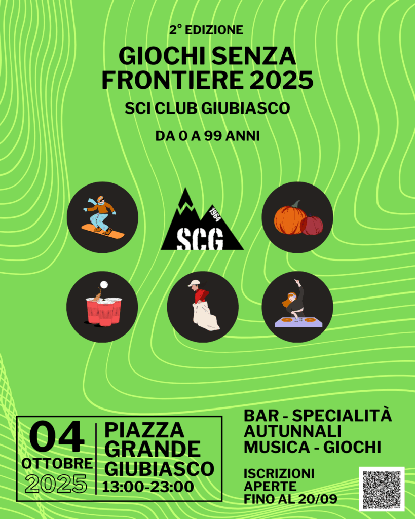Lo Sci Club Giubiasco organizza nuovamente i Giochi Senza Frontiere! Sabato 4 ottobre in Piazza Grande a Giubiasco, dalle 13:00, squadre di tutte le età si sfideranno a suon di giochi. Rifornitissima buvette e specialità autunnali a completare. Passaci a trovare, anche per sfide extra segrete aperte a tutti!