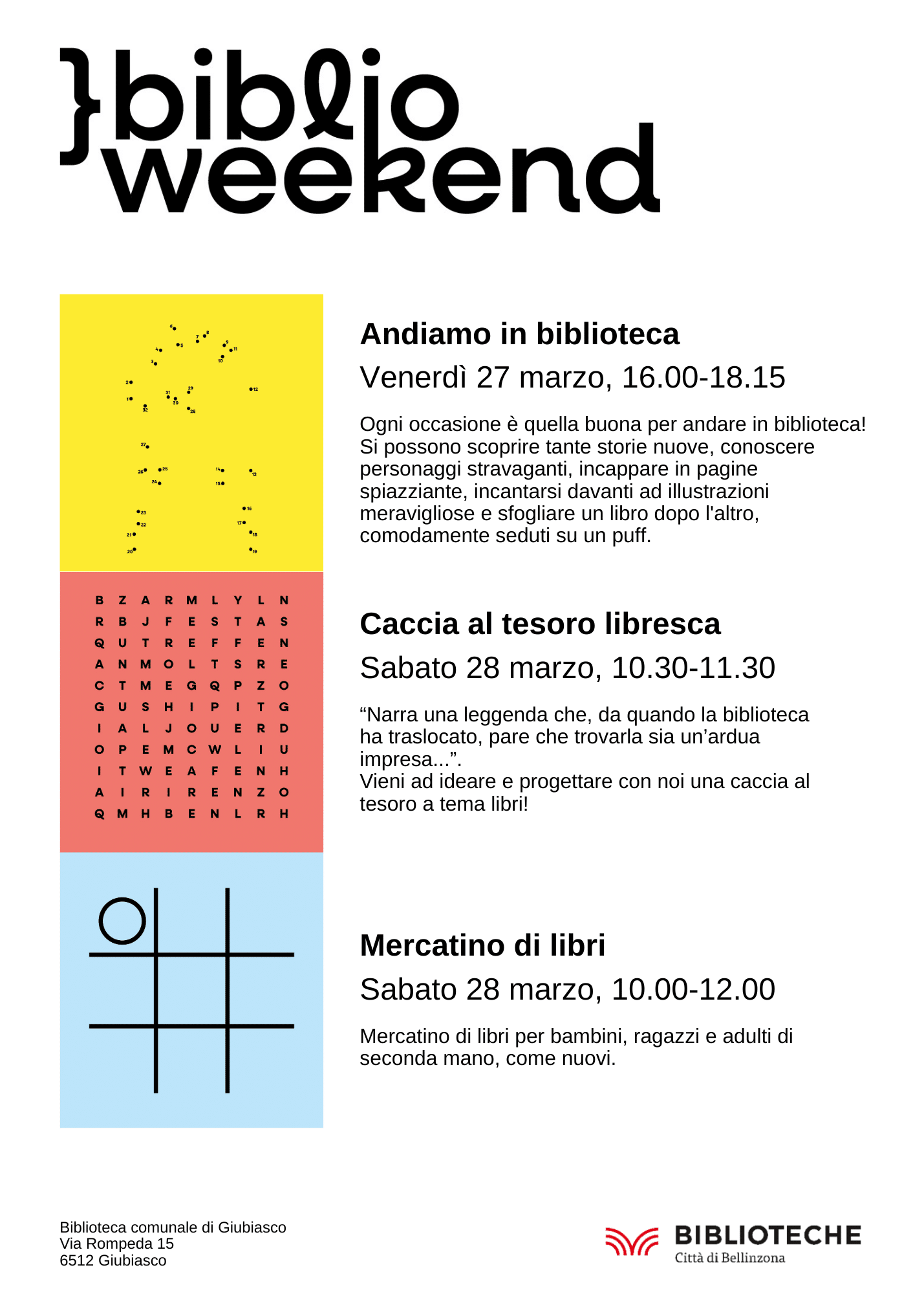 Dal 27 al 29 marzo 2026 si terrà in tutta la Svizzera il quinto BiblioWeekend. Per l’occasione la Biblioteca comunale di Giubiasco sarà aperta al pubblico anche il sabato mattina e proporrà un triplo appuntamento: