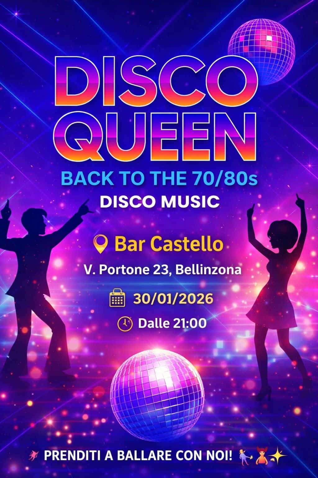 Nella serata di venerdì 30 gennaio, il Bar Castello ospiterà un imperdibile evento a tema anni ’70 e ’80, un viaggio musicale e di atmosfera tra i grandi successi che hanno segnato due decenni indimenticabili. Una serata all’insegna del divertimento, tra buona musica e stile retrò.