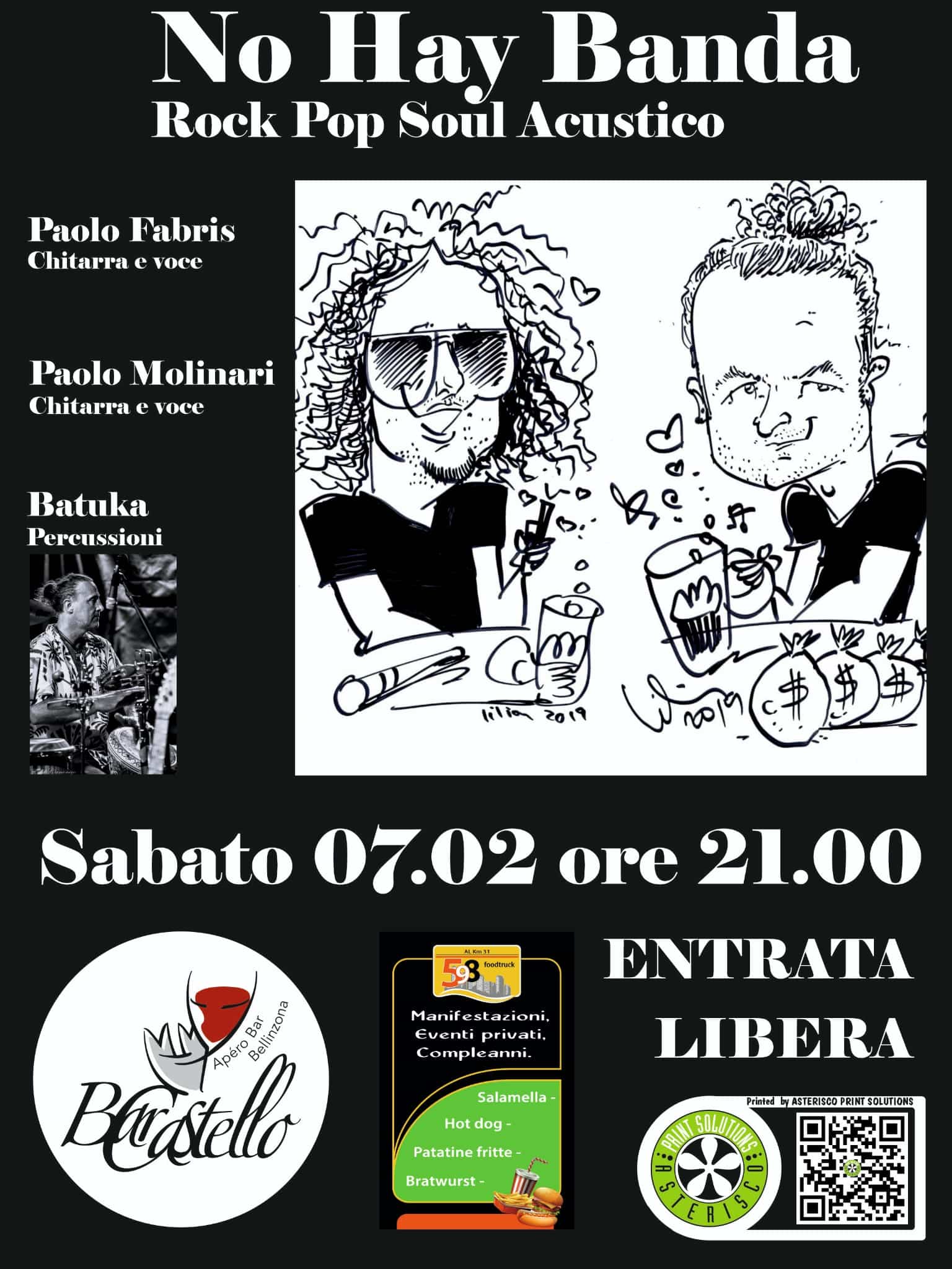Sabato 7 febbraio, a partire dalle 21:00, si esibiranno i “No Hay Banda” al Bar Castello di Bellinzona. La band rock-pop-soul acustica è composta da Paole Fabris (chitarra e voce), Paolo Miliani (chitarra e voce) e Batuka (percussioni).