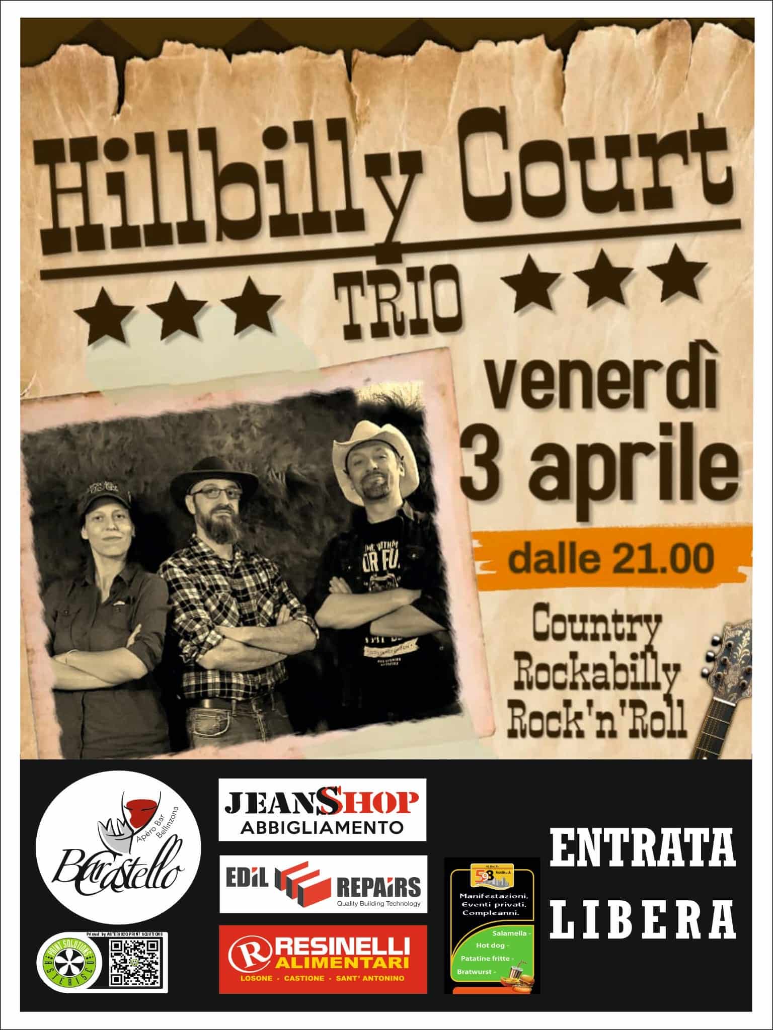 Venerdì 3 aprile si esibirà il trio Hillbilly Court per una serata di musica country, rockabilly e rock’n’roll.