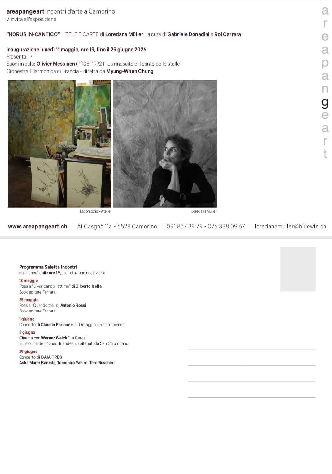 Lunedì 11 maggio ad Areapangeart si inaugura la personale di Loredana Müller, artista che unisce pittura, calcografia, poesia, musica e filosofia. La mostra presenta quattro grandi tele, tra cui Horus e Albero d’inverno, che dialogano con le opere più intime Voci degli Avi e con libri d’artista. Il percorso esplora il rapporto tra natura, vita e cosmo, unendo riflessione filosofica, spiritualità e sensibilità estetica, accompagnato da una composizione di Olivier Messiaen che crea un ponte tra colore, forma e suono.