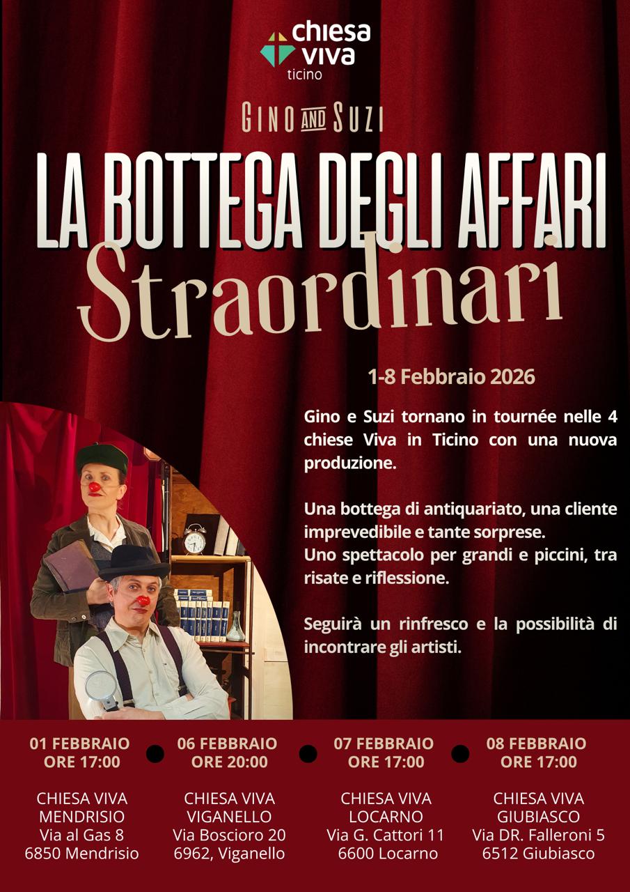 Gino e Suzi tornano in tournée nelle 4 Chiese Viva in Ticino con una nuova produzione. Una bottega di antiquariato, una cliente imprevedibile e tanta sorprese. Uno spettacolo per grandi e piccini, tra risate e riflessione.