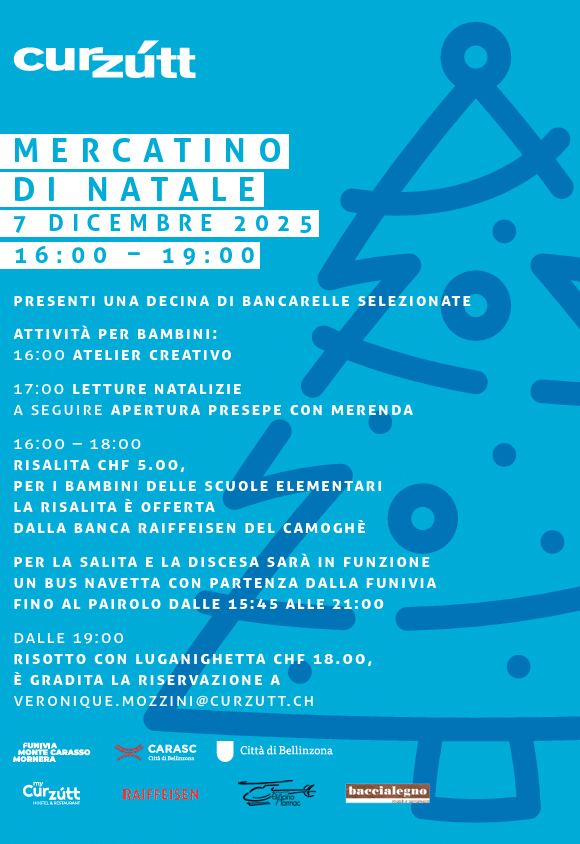 Il nucleo di Curzútt si veste di magia per accogliere il suo tradizionale Mercatino di Natale, un appuntamento che unisce la suggestione del luogo alla calda atmosfera delle feste. Dalle 16.00 alle 19.00, una decina di bancarelle selezionate animeranno le vie del nucleo con prodotti artigianali, creazioni originali e golosità natalizie.