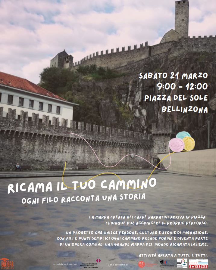 Ricama il tuo cammino è un progetto che unisce persone, culture e storie di migrazione attraverso un’opera collettiva: una grande mappa del mondo ricamata insieme. Il 21 marzo la mappa, che già accoglie i percorsi dei partecipanti ai caffè narrativi che si sono svolti nei mesi scorsi, arriverà in piazza del Sole a Bellinzona: con fili e punti semplici ogni cammino prende forma e diventa parte di un’opera comune. Tutte le persone che hanno vissuto un’esperienza di migrazione potranno aggiungere alla mappa il percorso che li ha portati in Ticino.