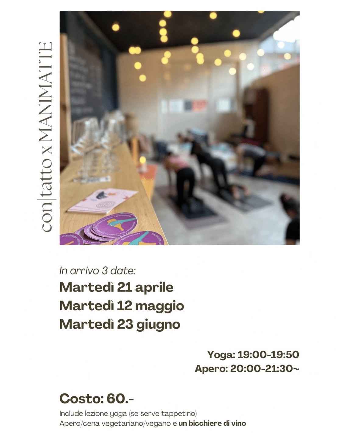 In compagnia dell’insegnante Ada (ConTatto) una bella sessione di Vinyasa Yoga e a seguire Aperitivo con le leccornie vegetariane a base di prodotti locali e i vini di Manimatte.