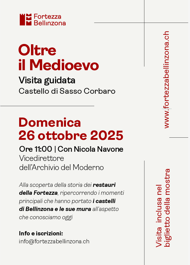 Domenica 26 ottobre alle ore 11:00 si terrà una visita guidata alla mostra Oltre il Medioevo presso il Castello di Sasso Corbaro. La visita sarà condotta da Nicola Navone, vicedirettore dell’Archivio del Moderno. La partecipazione è su iscrizione all’indirizzo info@fortezzabellinzona.ch, posti limitati.