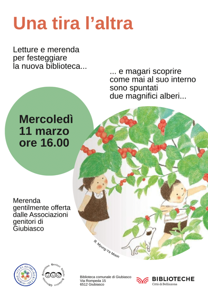 Mercoledì 11 marzo alle ore 16:00 si terrà un momento di letture e merenda per festeggiare la nuova biblioteca e scoprire come mai al suo interno sono spuntati due magnifici alberi. La merenda è gentilmente offerta dalle Associazioni genitori di Giubiasco.