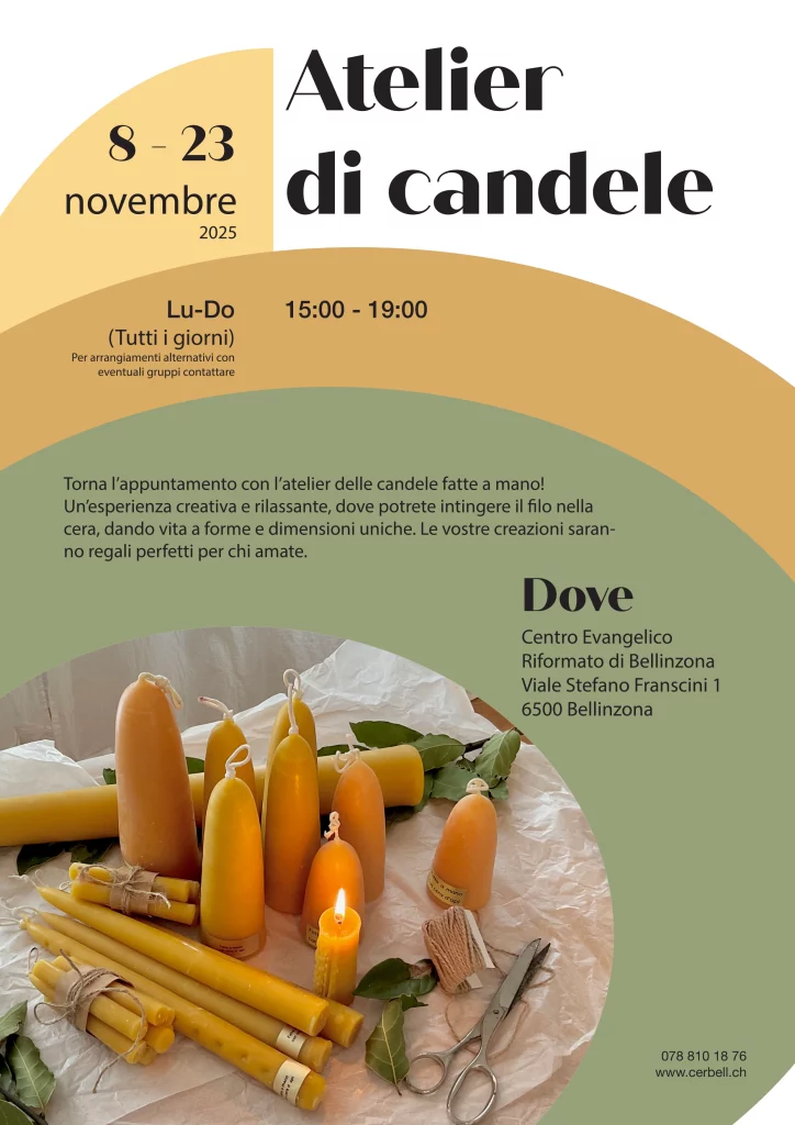 Torna l’appuntamento con l’atelier delle candele fatte a mano! Nella sala multiuso della Chiesa riformata di Bellinzona, dall’8 al 23 novembre, tutti i giorni, dalle 15 alle 19! Un’esperienza creativa e rilassante, dove potrete intingere il filo nella cera, dando vita a forme e dimensioni uniche. Le vostre creazioni saranno regali perfetti per chi amate. […]