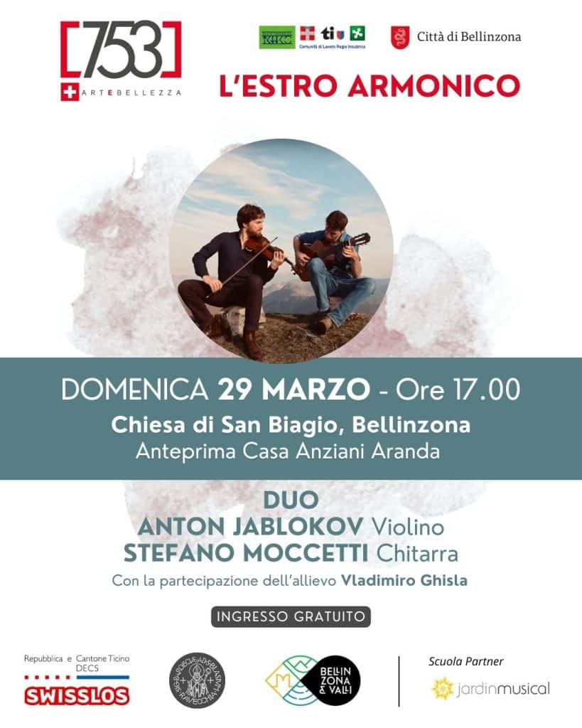 Terzo appuntamento della Rassegna l’Estro Armonico 2026: Il duo con il violinista Anton Jablokov (violino) e Stefano Moccetti (chitarra) si esibirà presso la Chiesa di San Biagio. Il programma prevede musiche originali, musica di De Falla, Ramirez e de Abreu. Vi sarà inoltre l’intervento musicale del giovane allievo Vladimiro Ghisla.